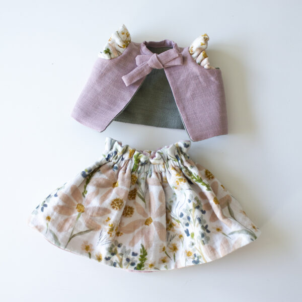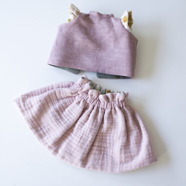 Suknička je mušelínová z jednej strany so vzorom lúky a z opačnej staroružová.